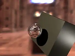 - Give the sphere a mirrored material : go to the Shading -> Material panel (F5) and find the Mirror Trans buttons.