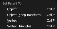 - Object: set the parent of the rest of the selection to the active (last-selected) object, clearing any existing parent relationships the new-children-to-be may have had. Any objects that were previously parented are reset to their original transformations before that previous parenting.