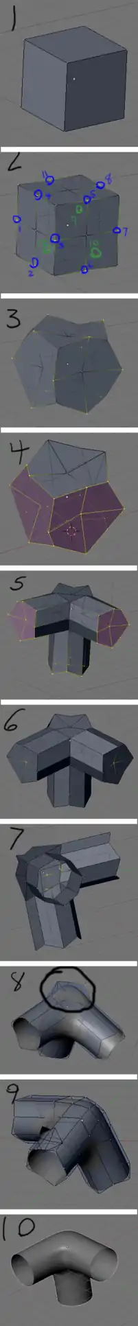 - Make sure you switch back to Median Point Pivot (SHIFT+,KEY) to straighten out pipe ends (10).