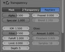 Just a bit further down from the Alpha field, look for two more fields: “IOR:” (“Index Of Refraction”) and “Filter:”.