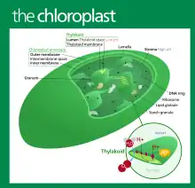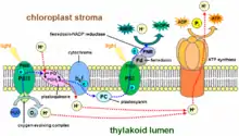 Photons from the sun travel 93 million miles into Photosystem II of the thylakoid. This excites the electrons in the chlorophyll molecule, which are then shifted around various "electron-acceptors"--each electron-accepter causing the electron's energy state to diminish. Moving around these excited electrons cause the electrons, and hydrogen molecules, in H2O (water) to be "donated" over to replace the excited electron's place in the various electron-acceptors in the chloroplast. This causes oxygen to be created as a waste product, as water is essentially stripped off of its hydrogens and electrons, leaving the oxygen molecules all by themselves. As the electron's energy state diminishes, groups of hydrogen protons are transported from the stroma over to the lumen.