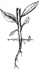 The stem arises during development of the embryo as part of the hypocotyl-root axis, at the upper end of which are one or more cotyledons and the shoot primordium.
