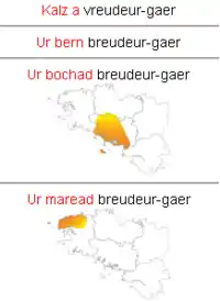 Breton spellingsAfter several attempts at unifying the spelling, two main spellings exist : the "peurunvan" ("completely unified" spelling) and the "skolveurieg" ("university" spelling). This course uses "peurunvan" as it is today the most commonly used. "Peurunvan" accommodates for dialectal differences. Most notably, the notation "zh" - used in the name "Breizh" ("Brittany") - must be interpreted according to the dialect spoken.
