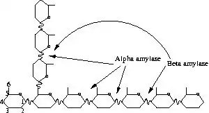 Conversion of barley starch into sugars is primarily the result of two types of enzymes - alpha amylase and beta amylase. Both enzymes break the chains of glucose which form starch at alpha 1,4 linkages. Alpha amylase breaks these bonds at random points in the starch chain. In contrast, beta amylase acts on the bond between the last 2 and 3 glucose residues in the starch chain, releasing the disacharide sugar maltose.