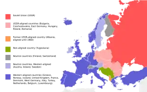 - The Eastern Bloc countries, which were described as being "behind the Iron Curtain". They signed the Warsaw Pact in 1955, a treaty establishing the mutual defense organization known as the Warsaw Treaty Organization (WTO) of communist countries; these included the Soviet Union, Poland, East Germany, Albania, Bulgaria, Romania, Czechoslovakia, and Hungary; but Albania withdrew in 1960. Yugoslavia was a communist state that remained non-aligned.