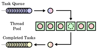 A simple thread pool. The task queue has many waiting tasks (blue circles). When a thread opens up in the queue (green box with dotted circle) a task comes off the queue and the open thread executes it (red circles in green boxes). The completed task then "leaves" the thread pool and joins the completed tasks list (yellow circles)..