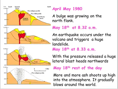This eruption is the deadliest and most economically destructive volcanic event in the history of the US. It was preceded by a two-month series of earthquakes and steam-venting episodes, caused by an injection of magma at shallow depth below the volcano (as the image below shows). When it erupted, it released the equivalent of 1,600 times the size of the atomic bomb dropped on Hiroshima. It ejected more or less 3km radius of material and killed 57 people. At the end of the eruption, the volcano appeared destroyed: 2,5 km cubical of the north flank had disappeared.