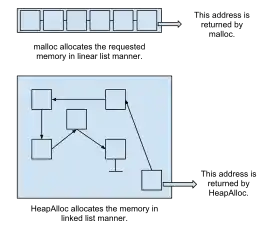 mallocallocates given byte-block in linear order. It requires continuous block of memory.HeapAllocallocates memory which is stored in linked list structure. It is advantageous.