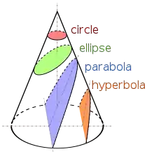 Conic sections are the intersections of a surface of a cone and a plane. There are three ways to intersect. The first method is to intersect the cone vertically, which the intersection will yield a hyperbola. The second method is to intersect the cone parallel to the outermost line of the cone, which will yield a parabola. The third method is to intersect the cone horizontally or slightly horizontally, which will yield an ellipse. For more information, see Conic section. If you have knowledge on this particular subject, you can help expand here.