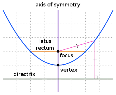 Part of a parabola (blue), with various features (other colours). The complete parabola has no endpoints. In this orientation, it extends infinitely to the left, right, and upward.
