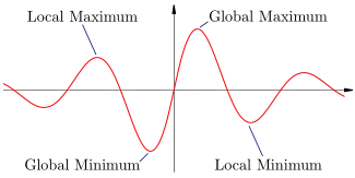 Maxima and minima are points where a function reaches a highest or lowest value, respectively. There are two kinds of extrema (a word meaning maximum or minimum): global and local, sometimes referred to as "absolute" and "relative", respectively. A global maximum is a point that takes the largest value on the entire range of the function, while a global minimum is the point that takes the smallest value on the range of the function. On the other hand, local extrema are the largest or smallest values of the function in the immediate vicinity.