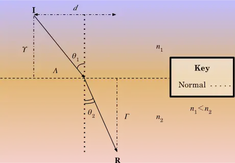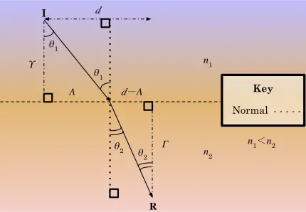 A light ray, according to Fermat's Principle of Least Time, travels in the fastest time over the least amount of distance (i.e. a light ray travels the path that results in the least amount of time wasted). The speed of a light wave is defined as the speed of light to the refractive index of the material traveled, or . Let a light wave travel through two materials, starting at and ending at where . The angle of incidence and refraction is given on the diagram to the right. What is the relationship between the light ray traveling through the two different materials?