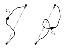 A simple path (also called a simple curve) is an oriented continuous curve that extends from a starting point to an ending point . Intermediate points are indexed by and are denoted by . A simple path should be continuous (no breaks), and may intersect or retrace itself. A "multi-path" is a set of simple-path/weight pairs: where is the weight that is assigned to path . Given two path/weight pairs and that cover the same path , the weights add up to get which replaces and . Any pair is removed. In addition given two path/weight pairs and with the same weight and , then and can be linked end-to-end to get the pair which replaces and . Assigning a path a negative weight effectively reverses its orientation: if denotes path with the opposite orientation, then is equivalent to . can consist of infinitely many paths, and each path may have an infinitesimal weight.