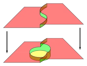 A simple surface is an oriented continuous surface. A simple surface may intersect or fold back on itself. A "multi-surface" is a set of simple-surface/weight pairs: where is the weight that is assigned to surface . Given two surface/weight pairs and that cover the same surface , the weights add up to get which replaces and . Any pair is removed. In addition given two surface/weight pairs and with the same weight , then and can be combined to get the pair which replaces and . Assigning a surface a negative weight effectively reverses its orientation: if denotes surface with the opposite orientation, then is equivalent to . can consist of infinitely many surfaces, and each surface may have an infinitesimal weight.