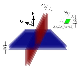 ![]() The intersection between a multi-path shown as a blue tube with a multi-surface shown as layers of red sheets. Vector F is the flow density through the blue tube. Vector G is the surface density in the red sheets. The green parallelogram is a 2D projection of the volume of the intersection. The intersection points become more dilute as the angle theta increases, so the intersection point density is the dot product of F and G. |