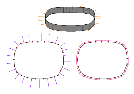 The image to the right extrudes the 1D surfaces in two dimensional space into 2D "ribbons" in 3 dimensional space. At the top a closed "ribbon" is shown. This "ribbon" is a surface that is always parallel to the vertical dimension, and whose boundary forms two identical loops that are vertically displaced from each other. The boundary loops are also perpendicular to the vertical dimension. The ribbon itself is partitioned into tiny rectangles whose height is equal to that of the ribbon. To the bottom left, a view of the same ribbon from the top down is shown. It can be seen that the length of the each surface vector is proportional to the length of the corresponding rectangular segment, since the heights are all uniform. To the bottom right, by rotating the surface vectors 90 degrees around the vertical dimension, the surface vectors now sum to , so the sum of the unrotated surface vectors is also .