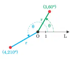 For example, the polar coordinates would be plotted as a point 3 units from the pole on the ray. The coordinates would also be plotted at this point because a negative radial distance is measured as a positive distance on the opposite ray (the ray reflected about the origin, which differs from the original ray by ).
