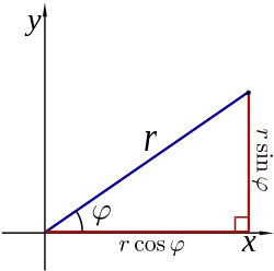 The two polar coordinates can be converted to the Cartesian coordinates by using the trigonometric functions sine and cosine: