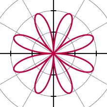 A polar rose is a famous mathematical curve that looks like a petaled flower, and that can be expressed as a simple polar equation,