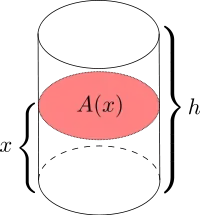 Formally the ideas above suggest that we can calculate the volume of a solid by calculating the integral of the cross-sectional area along some dimension. In the above example of a cylinder, every cross section is given by the same circle, so the cross-sectional area is therefore a constant function, and the dimension of integration was vertical (although it could have been any one we desired). Generally, if is a solid that lies in between and , let denote the area of a cross section taken in the plane perpendicular to the -axis, and passing through the point .