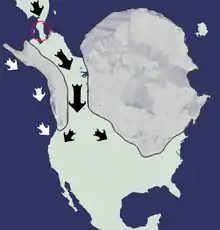 During the most recent of the Ice Ages large portions of the northern hemisphere were coated in ice. This ice covered much of what is now Canada. As all of this ice was formed the water levels around the world lowered, causing land masses previously inaccessible to become available. One such landmass was located where the Bering Strait is today: Beringia which formed a link between what is now Siberia and Alaska. This newly formed landmass is estimated to have been 1000 kilometres wide and 90 kilometres long (the modern distance between the two continents).