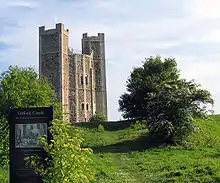 The construction of Orford Castle began in 1165 on the orders of Henry II and was completed in 1173. The design of the keep, a polygonal tower, is unique being circular in cross-section with three abutting rectangular towers. The castle tower is enclosed by a curtain wall with a gatehouse and flanking towers.