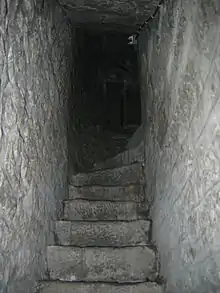 Finally, staircases may be placed on alternate sides of the structure (for example, from ground to first floor the staircase is on the north side, from first to second floor, it is on the south side). This arrangement means the attackers have to fight their way across the floor to reach the next staircase. In some designs, the rooms would be split in half with a wall and doorway creating an extra defensive point.
