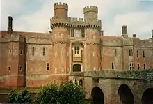 Herstmonceux Castle in East Sussex was built by Roger de Fiennes, Treasurer of the Household to Henry VI. Construction began in about 1441, the castle being built from Flemish brick. Although it is a superficially strong castle, with a large gatehouse and towers, the walls were too thin to resist a serious attack. It was primarily a private residence, set in large Elizabethan gardens. The castle fell into disrepair and was renovated with some modifications in the 20th century.