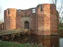 The castle is of brick construction in a quadrangle layout. The original design included corner towers linked by curtain walls with towers placed in the middle of each length of wall. A moat surrounds the castle with a wooden drawbridge giving access to the gatehouse.