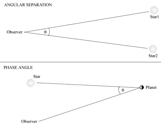 Finding the angles between two objects is a handy thing to be able to do in a script. It would mostly be useful for finding angular separations and phase angles (illustrated below) which can be used for a variety of other purposes.
