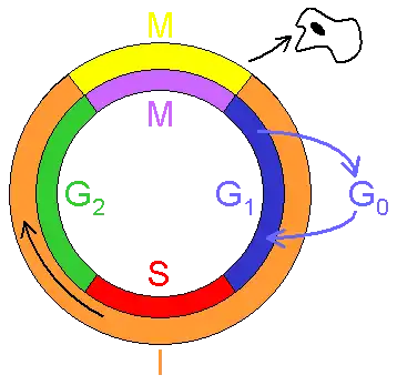 Schematic of the cell cycle. I=Interphase, M=Mitosis. The duration of mitosis in relation to the other phases has been exaggerated in this diagram.