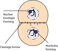 • Telophase: Two daughter nuclei form in the cell, and nuclear envelopes arise from the fragments of the parent cell's nuclear envelope. As nucleoli reappear, the chromosome become less condensed, and completes the division of the one nucleus into two genetically identical nuclei.