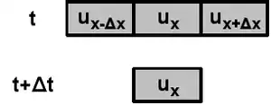 Each finite element at time is calculated from three neighboring elements at time (see figure at the right).