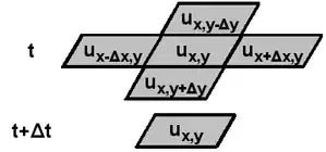Each finite element at time is calculated from five neighboring elements at time (see figure at the right).