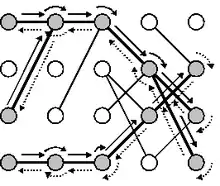 This algorithm traces paths through the preimage diagram. It starts at the first node at the left that is not masked by left boundary conditions. Depending on the position index value and whether there are links to the right there are four options: