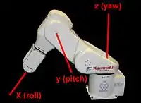 In some cases, for example robotics, it is more interesting to work with moving rotation axes (i.e. intrinsic rotations) instead of the fixed rotation axes (i.e. extrinsic rotations) discussed so far. Usually, the rotation relative to the base of the robot is referred to as “yaw”, the up-down rotation of the arm as “pitch”, and the next rotation as “roll”. Since the joints are rotated by each rotation, a description of rotations with moving rotation axes is required.