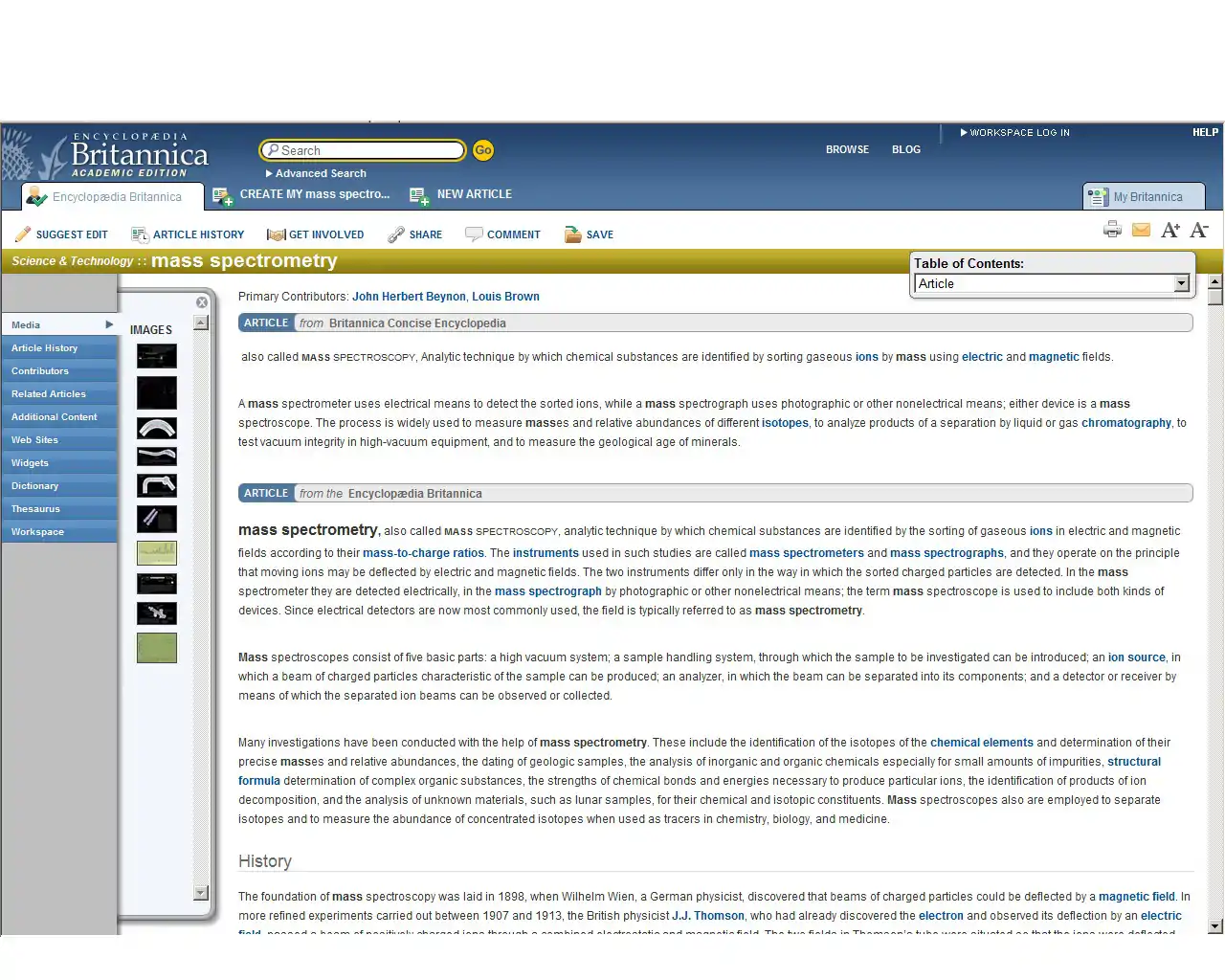 Searches for information on mass spectrometry were run on the two popular online encyclopedias below, the first on Wikipedia, and the second on Britannica Online.