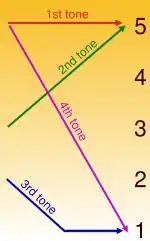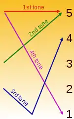 Every syllable in Chinese has a clearly defined pitch of voice associated with it to distinguish characters with the same sound from each other. Unfortunately, there is no indication of the tone given when reading a character, so the tones for words must be individually memorized. To help with this, pinyin uses four easily-remembered diacritical marks to tell you what the tones of words are. The diagram to the right shows the pitch changes of the four tones on a five-bar scale going from lowest (1), to highest (5), while the five tone marks are: