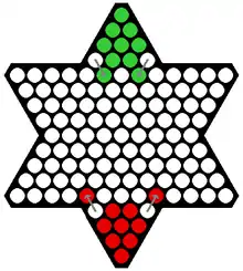 Green shows the two most common opening moves in Chinese Checkers; Red shows the next two more common moves.