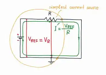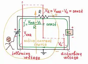 Since the resistor R has the property to keep up a constant current, they name it current-stable resistor. Let's realize this idea as it is simpler and more obvious than the idea of a dynamic voltage source considered above.
