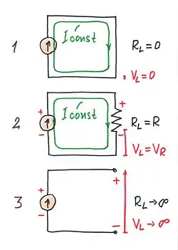 Ideal load. First, make a short connection at the output of the circuit. Since there is no voltage drop across the load, all the input voltage V is applied across the resistor R. As a result, the current is exactly as Ohm's law says: