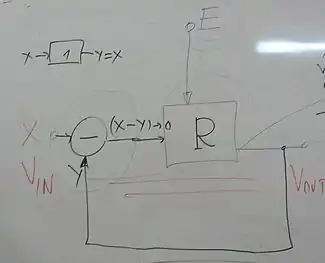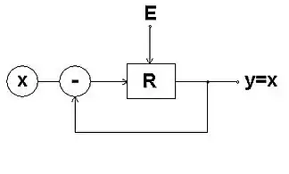 So, the simplest negative feedback follower consists of only three components: power (energy) source E, regulating element R and a subtractor (-). Negative feedback connects the system output (inverted) with the system input. In response to some disturbance "attacking" the system, the negative feedback tends to re-establish equilibrium again. We can already draw a pretty block diagram. Tencho65