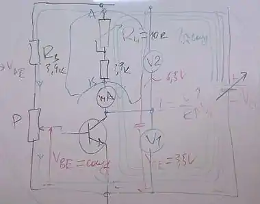 Then there are our watchfull eyes - the voltmeter V2, used to keep an eye on the voltage drop on the load resistor (the boss), another voltmeter V1, watching over the voltage drop on the transistor's collector-emitter junction, and an ammeter, which gives us a sneak-peak on the current flow.