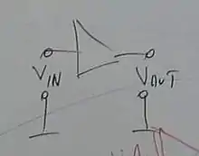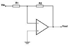 What does the parallel inverter do? First,we use the resistive parallel amplifier.We use this component for comparing Uin and Uout voltages.It is the system with a negative feedback.There are two resistors wich are used for comparing voltages. If R1-R2=0 then Uout =Uin,but if R1 is not equal to R2 then the amplifier receives the difference between Vin and Vout on its input. And also if Vin is PLUS and Vout is MINUS then there is a "virtual ground". Uout/Uin=-R2/R1 --78.90.51.95 (talk) 15:36, 19 May 2008 (UTC)galina spasova