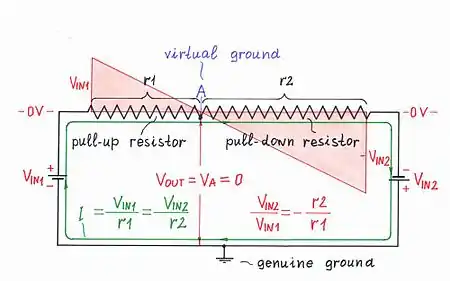 It's time to remember the famous Ohm's experiment that we have conducted in our laboratory during Lab 2. See at the end of the page where we have invented the so useful parallel voltage summer (subtractor). Eureka! We can use it as a subtractor with single-ended inputs in our inverting circuit! Let's do it.
