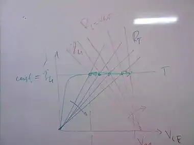 When we lower the load resistance the load line stands up; the transistor does the opposite - it increases its present collector-emitter resistance RCE (or just RT) so that to keep up a constant total circuit resistance. We may show RT by another line that begins from the coordinate system origin (the trick is to think of the present resistance RT as an ohmic one). So, this line will rotate around the origin and incline as well. As a result, the crossing point moves along a new almost horizontal line - the output transistor characteristic. This line is imaginary, unreal, artificial but we can see only this line; it represents the behavior of a current-stable resistor.