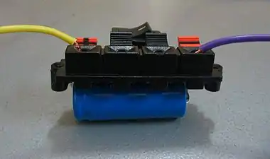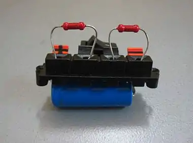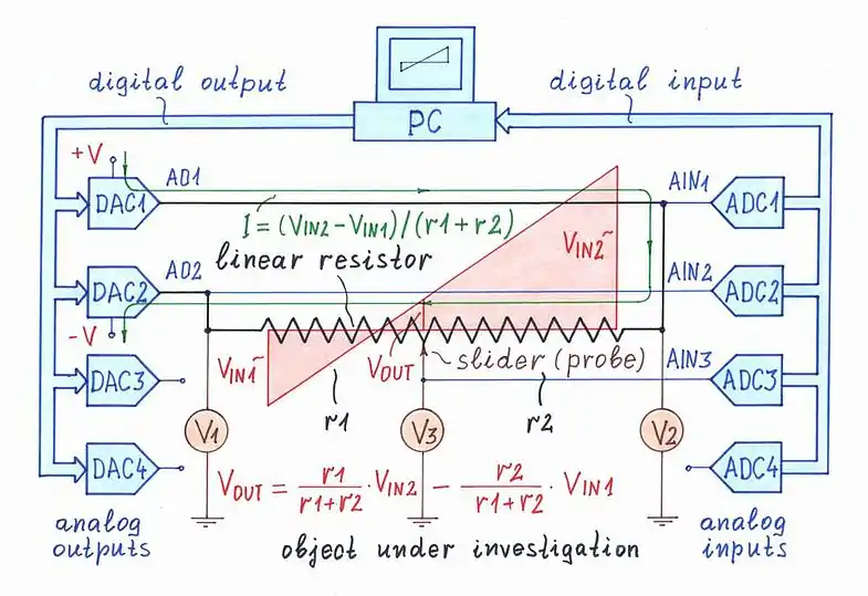 Resistor. Do you remember the linear 4.7 kΩ varying resistor from the previous laboratory exercise? As far as I can remember, we carried out a "reverse engineering" then taking it to pieces:) What do we do now? Suggest a solution! A student: Yes, I do... Obviously the colleague suggests to supply such a resistor by the DAC's 10 mA outputs without any problem (calculate the maximum current). Thus we can use it instead the low-resistive wire. Then we supplied only the one of the resistor's terminals. Now, let's complicate the arrangement and make it more confusing:) by supplying both the ends (we suspect it might be very interesting). Well, connect AO1 (DAC1) to the right and AO2 (DAC2) to the left end of the resistor.
