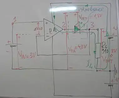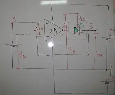 Now the op-amp has to "insert" the "helping" voltage VF into the circuit; so, how to connect it?
