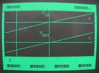Transfer characteristic. Microlab can help us to obtain this curve on the screen. There is no time in this graphical presentation; there is only input and output quantities. We might discern three regions on this curve: negative saturation (large), active region (narrow) and positive saturation (large).