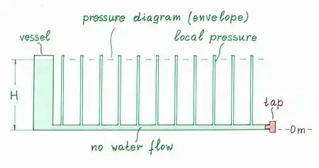 Really, the levels of the water bars (accordingly, the local pressures along the pipe) decrease gradually from left to the right. The envelope of the pressure diagram is a triangle.